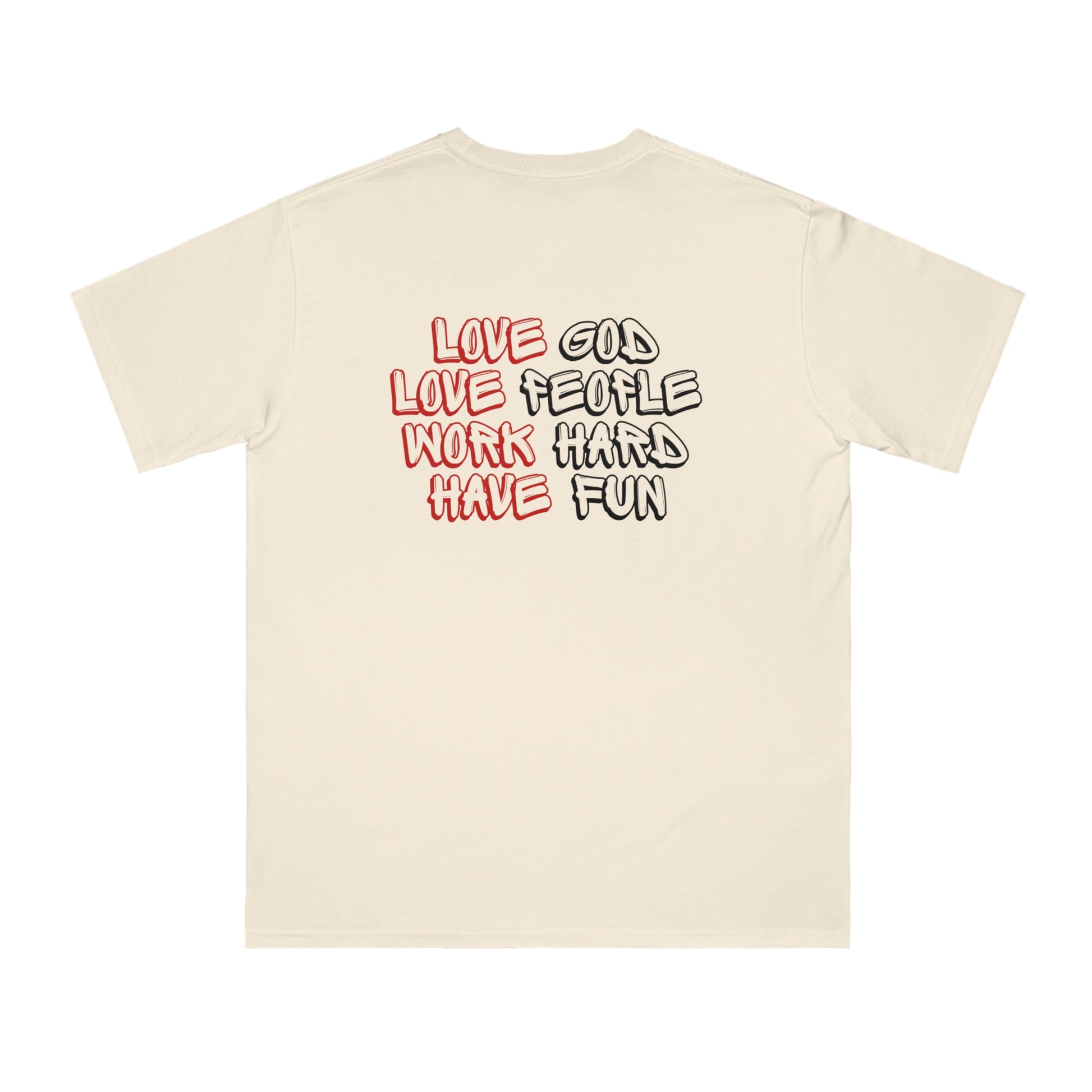 Organic Cotton Graphic T-Shirt - "Love God, Love People, Work Hard, Have Fun"