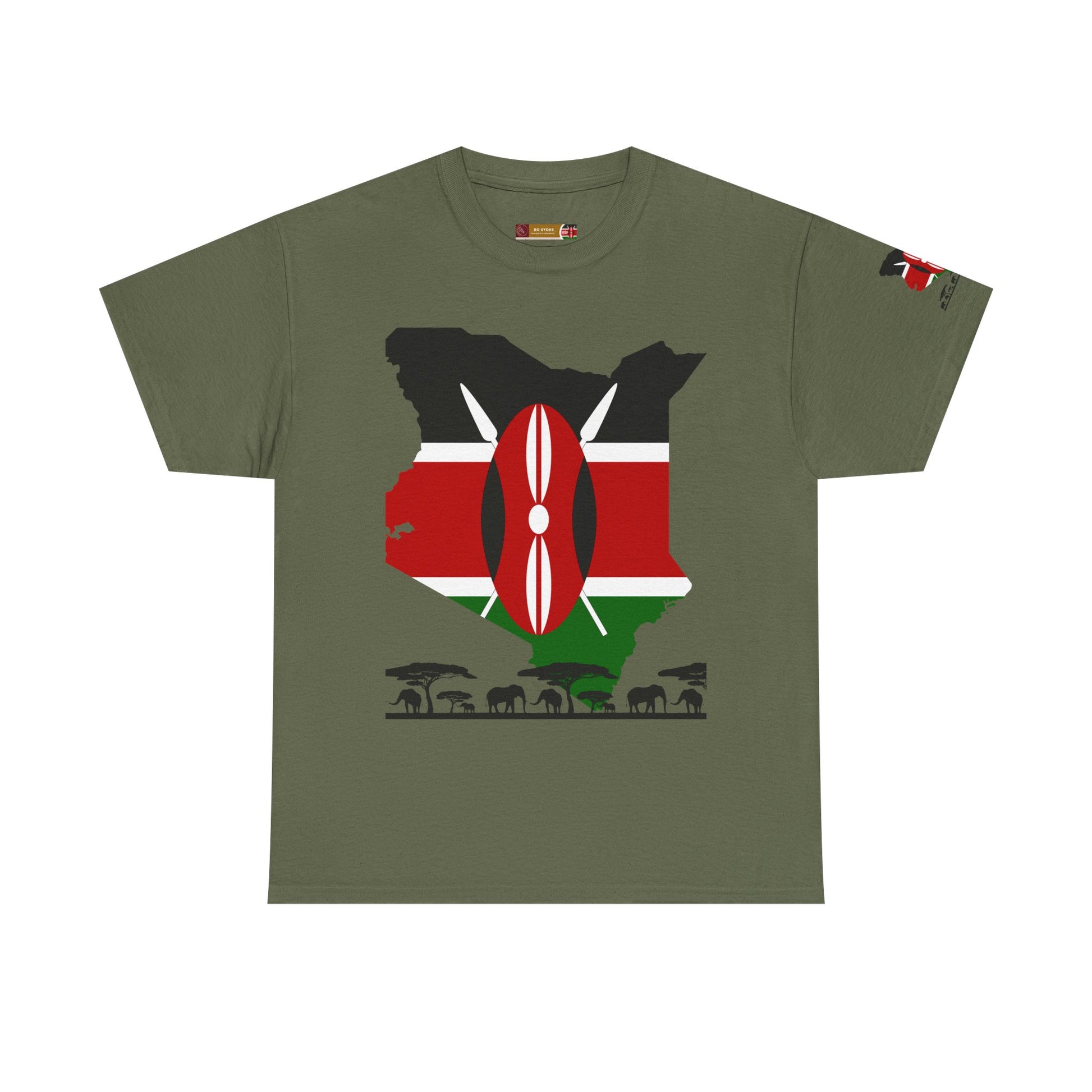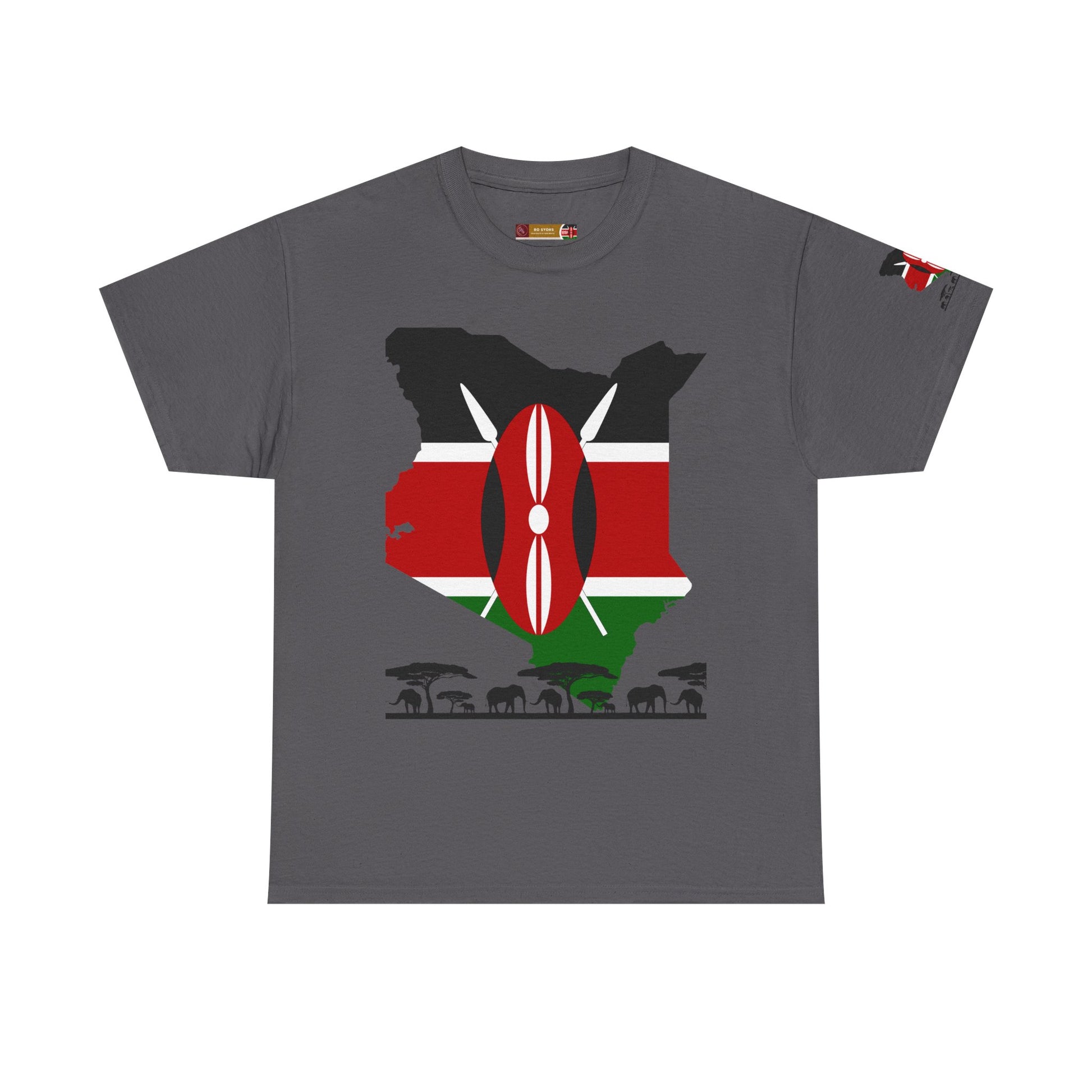 A unisex t-shirt made from 100% heavyweight cotton. It features a graphic of the Kenyan map draped in the colors of the flag.
