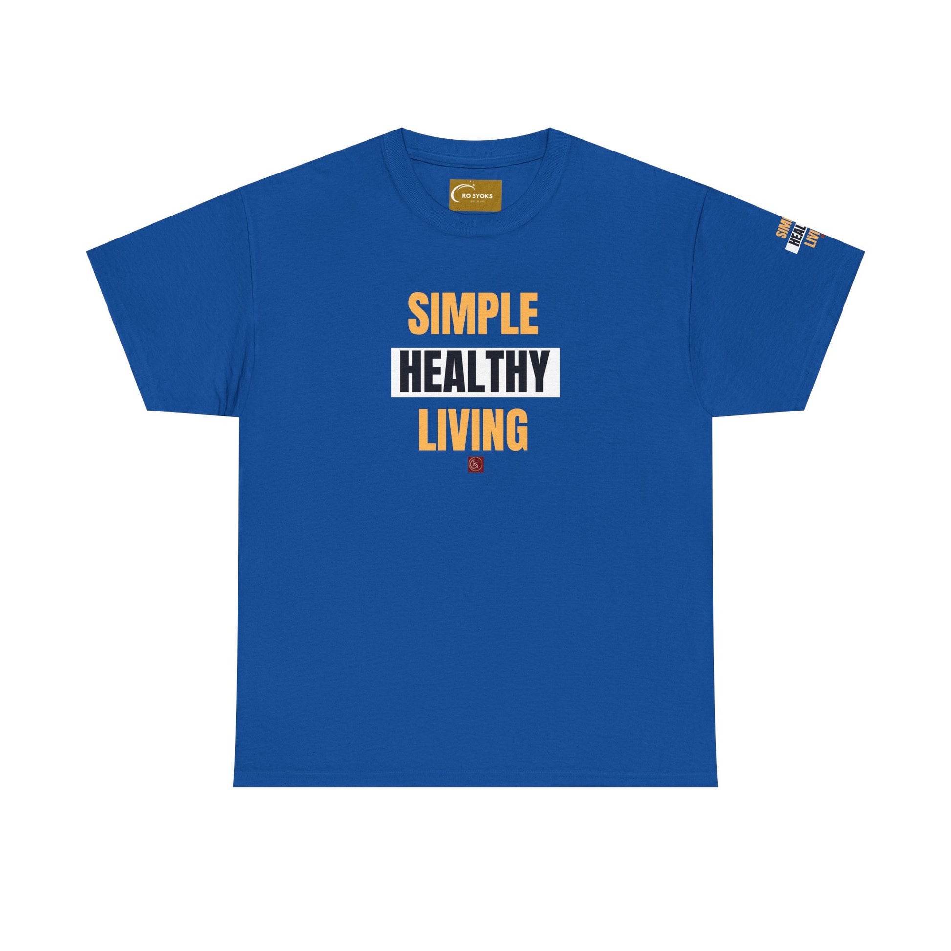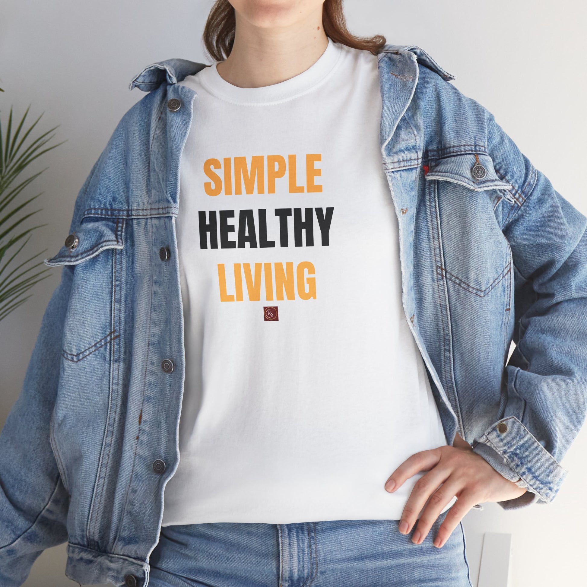 This Gildan 5000 unisex t-shirt is made from 100% pre-shrunk heavyweight cotton with a classic cut. It features a "Simple Healthy Living" slogan print on the front and is designed for a structured, durable fit that holds its shape.